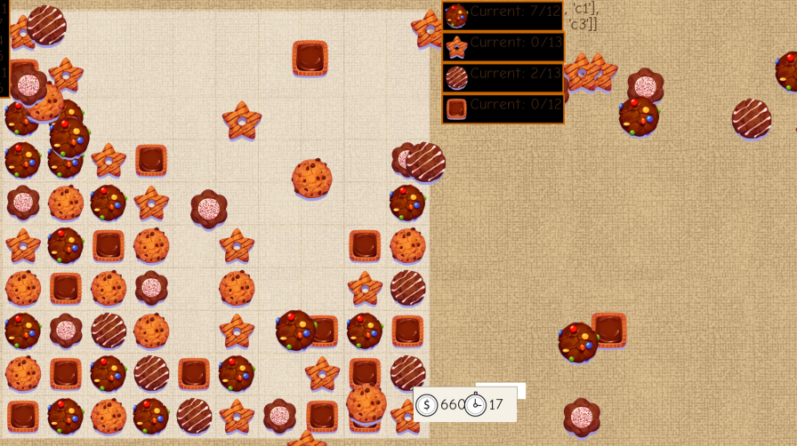 After struggling for awhile, I decided to reevaluate. Maybe I dont get rid of them? I thought it might be a cool level of difficulty if cookies scattered all over, so I pivoted to do that instead of fighting against it.