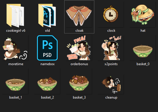 Mostly GUI assets. The basket is to be used for the score, the clock is obviously the timer – hat, cloak/shawl to purchase, then the art for the bonus rewards upon completing the special requests.